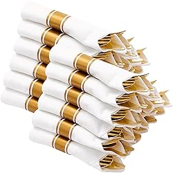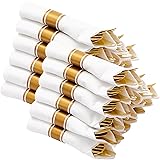 GREAT VALUE 120 PACK: Effortlessly create a luxurious tablescape with our elegant pre rolled gold plastic silverware set. These gold wrapped silverware set disposable includes 120 forks, 120 knives, 120 spoons, and 120 premium napkins for an instantly elevated guest experience HEAVY DUTY & BPA-FREE: These pre rolled silverware set disposable are made from BPA-free plastic, ensuring safety for you and your family. Designed to be sturdy, our gold disposable heavy-duty plastic silverware set will not deform or break and is safe for use with all food, ensuring a happy dining experience CONVINENT OR REUSABLE: Simplify hosting with our pre wrapped silverware and napkin: skip pre-party style stress, toss them after use for instant cleanup,making mealtime hassle-free. Moreover, these gold wrapped plastic silverware set are easy to clean and store, you can hand wash them for reuse ELEGANT DESIGN: This wrapped gold plastic silverware is exquisitely designed and help you easily set the perfect luxury party table in no time ,making your party more colorful and leave your guests with a great dining experience PERFECT FOR ANY OCCASION: These disposable utensils set with napkins are perfect for party, weddings, birthdays, engagements, Valentine's Day, shower parties, graduations, or any other holidays, This is a great matching item for all dining events