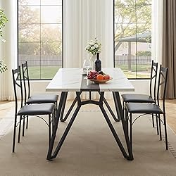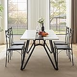 WIDE TABLE TOP: The large 70.9 X 35.4 inch table top provides plenty of space for up to 8 people, perfect for parties or as a conference table. LUXURY TABLE DESIGN: The black and white two-tone design with marble texture allows the wooden table top to imitate the charm of marble, and the table top is waterproof, scratch-resistant and easy to clean. STRONG AND STABLE: The dining table is made up of 3 pieces of premium MDF and high quality steel for stability and sturdiness. The table can hold up to 330 pounds to ensure a solid foundation for your experience. ADJUSTABLE FOOT DESIGN: The bottom of the table is made of sturdy steel for stability and firmness, and the bottom is equipped with 4 adjustable feet to maintain stability and balance even on uneven floors, and to prevent scratches on the floor. EASY ASSEMBLY: The product comes with a clear assembly guide, and each part is clearly labeled, making it very easy to assemble.