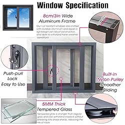 【Heavy Duty Shed Window】: This window is specifically designed for home construction, combining beauty with practicality. With transparent glass and a built-in screen window, it not only provides excellent views and ventilation but also effectively prevents little items from entering, adding comfort and peace of mind to home life, ideal for home construction 【Aluminum Sliding Window Frame 8cm/3in Wide】: Our rust resistant Window are crafted with durable aluminum and boast a lightweight yet robust construction, and able to withstand harsh weather conditions. Ideal for chicken coops, basements, barns, households, stores, snack bars, sheds, playhouses, garages and outdoor Window structures alike. 【Basement window 5 (MM) Thick Tempered Glass Window】: Our 5 (mm) thick sliding Window feature tempered glass, providing durability and safety; With the double sliding rails, you can freely move the Window to the middle or side according to your needs. 【Easy to Install and Use small window】:Includes tempered glass window, frame and screws complete kit. With our kit, you can quickly DIY and install these house Window into the space you need.you just need to embed the window frame into your window opening, tighten the screws, then install the panel and finally fill the gap with foam adhesive 【Aluminum Storm Window Customizable Sizes】:If the size you need is not listed, don't worry, we offer customization. All you need to do is tell us the width and height of your window opening