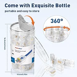 【Strong anti-interference】RJ45 modular plugs are made of PC material, good durability, anti-aging and flame retardancy; the internal insert is made of brass and has gold plating to improve electrical conductivity, effectively reduce electromagnetic interference (EMI) and crosstalk, and maintain good signal stability in noisy environments to ensure high-speed and stable data transmission 【Compatible cables】RJ45 pass through connectors are designed for Category 6 unshielded systems with a diameter of 1.1mm, supporting 24-26 AWG round or flat stranded wires, accommodating up to 6.1mm outer diameter; CAT6 23 AWG is supported for solid cable only 【High-speed transmission】 Cat 6 ethernet crimp connector supports transmission speeds up to 1000Mbps and transmission frequencies up to 250MHz, far exceeding Cat5 /Cat5e connectors , suitable for online games, large-scale file transfer and other application scenarios that require large bandwidth, and meet the needs of modern homes and enterprises for high-speed networks 【Sealed and sturdy product package】 200-Pack RJ45 Cat6 Pass Through Connectors come with a sealed pull ring type bottle, moisture-proof and waterproof, portable and easy for you to store when you aren't planning to use all at once 【Wide compatibility】 Pass through Cat6 plugs can be used with Cat 5 and Cat 5e ethernet cables, providing reliable connections for PCs, computers, routers, switches, and security systems. 【Stable Connection】 Cat6 connector adopts a 3-pronged structure design, which can be in stable contact with the core in the network cable, not easy to deform and damage, maintain good elasticity, and ensure the reliable connection between the ethernet cable and RJ45 plugs . (The number of insertions and dials can reach more than 2000) 【Support standards】 T568A/T568B are supported, convenient for network engineers or ordinary users to select the appropriate wiring mode according to the actual wiring requirements and existing network architecture, so as to realize the correct construction and connection of the network