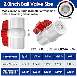 PVC Ball Valve: The shut-off valve socket is made of high-quality PVC material, which has excellent corrosion resistance, UV resistance, frost resistance and impact resistance; This water PVC valve can be used for a long time in both indoor and outdoor environments, and its service life is much longer than that of ordinary pipe fittings. In addition, this PVC material is environmentally friendly and non-toxic, which can ensure the delivery of clean water, making it safe and reliable to use Leak-proof Design: The slip PVC ball valve adopts an integrated structure, which is compact and firm, effectively preventing water leakage and ensuring the stable operation of the water pipe system. The water pipe valve with a red non-slip T-handle, the valve supports 1/4-turn quick on-off, allowing precise adjustment of water flow and rapid water cut-off in case of emergency. The inner wall of the pipe fitting is smooth, which is not easy to scale, ensuring smooth water flow 2.0inch Sprinkler PVC Valve: The shut-off PVC ball valve features a 2.0inch socket, specifically designed to fit PVC pipes with an inner diameter of 2.0 inch for a precise connection. Each package includes 2 irrigation PVC valve, making it an ideal choice for contractors or DIY enthusiasts engaged in multiple projects Versatile Applications: This T handle shut-off valve is easy to use and has a sturdy material, withstanding a working pressure of 150psi. SCH40 PVC water pipe valve is suitable for various scenarios such as domestic water supply, irrigation systems, swimming pools, aquaculture, and industrial pipelines, meeting the needs of all kinds of your indoor and outdoor water projects Easy Installation: The red T handle shut-off valve socket is made of high-quality PVC raw materials, which has good adhesiveness; Whether for DIY or professional use, the ball valve can be easily operated and installed. The bright red T-handle of the pool ball valve is easy to identify, which can improve the visibility of hot and cold water pipes and reduce the probability of accidental operation
