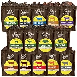 DELICIOUS FLAVORS TO TRY: Our assorted jerky variety pack features bestselling flavours like original beef jerky, black pepper, teriyaki, honey teriyaki, sweet & spicy, chipotle bourbon, blackened cajun, hot, habanero, ghost pepper and exotic jerky flavours like original venison, elk, buffalo, wild boar jerky. A delicious mix for every jerky lover to enjoy. CLEAN INGREDIENTS, HEALTHY SNACKING: Savor beef jerky snacks made with premium pasture-raised meat and clean ingredients. Each bite delivers high protein, low fat, and low sugar—perfect for healthy beef jerky fans, keto followers, and low-carb lifestyles. ON-THE-GO, GLUTEN-FREE SNACKS: Our gluten free beef jerky is crafted with natural ingredients, giving you a convenient high protein beef jerky that fits your day. Great for work, travel, or college study snacks, it’s the ideal guilt-free boost anytime, anywhere. PERFECT JERKY GIFT: This beef jerky variety pack is the ultimate choice for beef jerky gifts for men, a jerky gift basket, or a beef jerky gift set. Whether birthdays, holidays, or a snack box college care package, it’s a gift that always hits the spot. PREMIUM QUALITY, MADE IN USA: Jerky.com is known for bold flavors and premium quality. Our beef jerky is made in the USA with pasture-raised, locally sourced meats. Healthy jerky for adults, crafted with care for a taste experience that stands out.