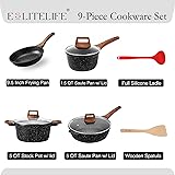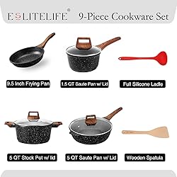 Eco-friendly Non-Stick Granite Coating & Super Easy to Clean - Our cookware set interior is coated by non-stick granite coating, SGS approved, 100% PFOA free. Require less oil or butter for cooking and minimal scrubbing for a spotless clean, giving you a healthier and more enjoyable at-home cooking experience. Healthier Way of Cooking - ESLITE LIFE 9 Pcs Pans and Pots Set Includes: (1)1.5 QT saucepan with lid, (2)9.5 inch frying pan, (3)5 QT stock pot with lid, (4)11 inch saute pan with lid, (5)wooden spatula and silicone ladle, here we provide a healthier way of daily cooking. The heat resistant bakelite handle are suitable for grasping and staying cooling while cooking. Time to upgrade your pots and pans and spruce up your kitchen decor! Compatible with All Stovetops - Design with perfect magnetized base makes it rapid heat transfer and long-time use, used effectively on gas, ceramic, electric, and induction stove tops, made for any kitchen and cooktop, an ideal replacement solution for your aging, worn out, or failed cooking equipment. Sturdy & Durable Body - The advanced die-cast aluminum technology, combined the advantage of cast-iron and traditional riveted cookware, conducts heats quickly & evenly, the thicken induction compatible bottom provides a stable heat distribution during cooking, rapidly heating up, saves time and energy. Service & Guarantee - ESLITE LIFE Cookware Store 100% passes strict multi inspection process. In case you receive defect items caused by delivery or If any problems while using our product, please feel free to contact us, you will be guaranteed to get 100% refund or new replacement. Really appreciate your trust and ordering!