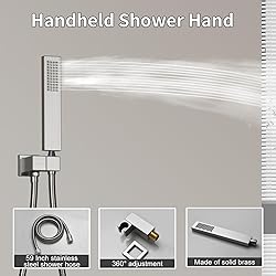 4 Functions Shower Modes:Full body shower system includes rainfall shower and 8 inch shower head, handheld shower, and 6 body spray jets. Corresponding knob control the corresponding spout functions, and you can choose to use each function individually or use all shower functions at the same time. LED 16 X 26 inch oversized shower head: large enough shower space to enjoy the shower to the fullest. Whether you want a relaxing ambiance or an invigorating shower, this shower head adds a touch of luxury and modernity to your bathroom. Anti Scald Thermostatic Function & Temperature Display:our shower jets system is equipped with a pressure balanced valve maintain a precise water temperature. no battery required, real-time display of water temperature. You can fine-tune the water temperature to your liking at any time, fast and precise Revitalizing 6 PCS Shower Jets for 360° Massage:Includes 6 body jets that deliver high-pressure water flow for a full-body massage experience, washing away fatigue and providing a spa-like sensation High Quality SATISFACTION AFTER SALES SERVICE 5 YEAR:AYIVG brand is with you, regarding our full body shower system, if you have any problems during installation/use: missing accessories, damage or the product does not work properly, please contact us at the first time, we will surely provide you with the most satisfactory soluti.