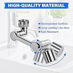 【1440° Rotating Design】This rotating faucet aerator extension features a user-centric design. The U-shaped extension rotates 360°, allowing water to easily reach every corner of the sink for easy cleaning and simplified maintenance. Note: Faucet extension dimensions: 96mm (L) x 45mm (W) x 60mm (H). Faucet connector diameter: 24mm. Spray head height: 20mm. Please confirm dimensions before purchasing. 【Water Flow Modes】A gentle aerator mode is suitable for everyday use, allowing you to control the water flow. 【Premium Materials】This multi-functional sink faucet extension is made of high-quality thick copper metal with a polished chrome plating finish, effectively resisting daily corrosion. This sturdy and durable rotating faucet extender ensures a comfortable grip, longevity, and rust resistance. 【Easy Installation】The universal adapter is compatible with 99% of faucet fittings, and the included 3 rubber gaskets and Teflon tape ensure a leak-proof seal. Simply choose the appropriate washer or Teflon tape according to your faucet type (Teflon tape can be used directly for leaks). 【Wide Application】This rotary faucet extender is suitable for kitchen sinks, bathroom vanities, and various faucets. It is compatible with 24mm external threads (for sink faucets), 22mm internal threads (for angle valves), and 20mm internal/bottom threads (for washing machine faucets). Practical and flexible, it meets various household plumbing needs, saving you valuable time.