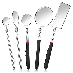 【Versatile Set】Includes 5 pcs telescoping inspection mirrors with different sizes and styles, Ideal for inspecting vehicles, mouth, eyelash、makeup adjustments, and hard-to-reach corners. 【360° Rotating】Features a flexible 360° rotating mirror head and retractable handle, allowing easy inspection of tight spaces, under vehicles, or precise makeup application with optimal angle control. 【Durable Material】These observation mirrors are made of stainless steel with a rubber-coated anti-slip handle for a secure grip. The compact metal frame fits in shirt pockets for portability, and the lightweight design ensures fatigue-free use. 【Practical Design】Each retractable inspection mirror collapses to a compact size for easy storage. The telescopic rod adjusts effortlessly, while the mirror’s rotation provides full visibility without straining. 【Multi-Purpose】The rotating inspection mirror can meet different needs, whether it is professional repair, daily beauty, or housework. It is perfect for mechanics, dentists, makeup artists and DIY enthusiasts, and can be conveniently stored in the garage, toolbox, or makeup bag