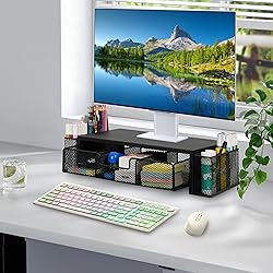 【Keep your desk tidy】This computer stand instantly organizes your workspace with 2 pen holders and drawer, keeping your essentials neat and within reach. Just unbox it—no tools needed! Enjoy a cleaner desk and boost productivity in seconds. No assembly. No hassle 【Space Saving】This monitor stand has a built-in drawer and two hanging pen holders – perfect for stashing your office supplies and keeping them within reach. Tidy up your work area and feel calmer at your desk 【Ergonomic Design】Improving your posture by elevating your monitor to the needed ergonomic viewing height, reduce the risk of neck and eye-straining while providing a better viewing experience 【Sturdy Stable】Crafted from high-quality metal, this monitor stand is sturdy with a scratch-resistant finish, ensuring long-lasting use. Equipped with drawer and 2 pen holders 【Seamless After-Sales Support】Need help? Our 24/7 customer service team is here to assist you. All issues are answered within 12 hours. Your satisfaction is our priority