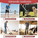 【4-in-1 Design Saves Time for Backyard Chicken Keepers & Small Farmers】:This ergonomic chicken coop scoop combines rake and sifting shovel in one—no need to switch tools when gathering waste, feathers, or debris! The sharp tines quickly collect manure, while the sifting function separates it from bedding in a single motion, cutting your cleaning time in half. Perfect for busy chicken keepers and small-scale farmers who want to streamline coop or stall chores. Installation is a breeze (follow the main image video) and takes just minutes to set up. 【Multi-Scene Sifting Scoop Tool for Farm, Yard & Home Use】:More than just a chicken poop scooper! It sifts manure from bedding for chickens, goats, rabbits, or pigs (saving you money on bedding replacements). In the yard, it picks up dog/cat waste without leaving debris. At the beach, it sifts shells and trash from sand; in gardens, it rakes leaves or removes weeds; in winter, it clears light snow from patios. Ideal for homesteaders, pet owners, and anyone needing a versatile outdoor cleaning tool. 【Rust-Resistant Stainless Steel for Heavy-Duty Farm Use】:Crafted from heavy-gauge stainless steel, this dog poop scooper resists rust and wear—even in damp coops or outdoor environments. The reinforced welding at the shovel head and pole connection ensures it won’t bend, deform, or break under heavy loads (like wet manure or clumpy bedding). Trusted by backyard chicken keepers and small farmers for its long-lasting sturdiness, it’s built to handle daily farm chores for years. 【Adjustable Handle to Ease Back Strain for All Users】:With 4 adjustable lengths (23", 38", 52", 66"), this chicken coop accessory fits users of all heights—from teens to adults. The ergonomic grip ensures comfortable handling, reducing back and arm fatigue during long cleaning sessions. Metal litter scooper Perfect for families with multiple people caring for the coop, or farmers who need to clean different areas (low coops vs. tall stalls) without switching tools. 【Large-Capacity Metal Scoop – Fast Waste Sifting】: The 12-inch extra-wide head holds 2x more waste than standard scoops, cutting down trips to the compost pile. Its innovative honeycomb sieve holes sift quickly without clogging—separating droppings from sand, straw, or wood shavings in seconds. The precise hole size keeps valuable bedding intact (saves you money on replacements!) while ensuring every bit of waste is removed. No more tedious, repeated sifting! 【Easy Assembly & Cleaning】: Assembly can be completed in just a few minutes! The package includes all hardware (anti-loosening screws, wrench) and even a pair of gloves to keep your hands clean. Just align the pole sections, twist to lock, and secure the shovel head with the included screws—no complicated instructions needed, and it stays rock-solid during use (no shaking or wiggling!). Cleaning is just as easy: rinse the scoop head with tap water or hose it down, and dirt, sand, or manure washes off instantly—no scrubbing required.