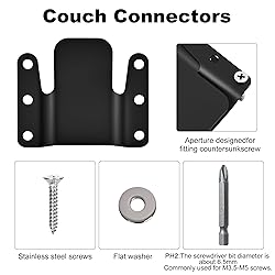 - "1.Set Contains:Sofa connectors(8 sets, 16 pieces), 96 screws, 96 flat washers, 1 Screwdriver bits." 2.Sectional sofa connector: These connectors for sectionals are 2.95x2.6 inches in size,1-inch long screw. 3.Material: These sofa connectors are nice, heavy-duty, thick metal. The surface is smooth, strong and durable. 4.Easy to install: Accessories are included, installing the sofa latch is very simple, just make sure you take good measurements, measure twice, install once 5.Widely Used: Couch clips for sectionals are not only suitable for connecting sofas of all sizes, but also can be used for chairs, recliners, beds, and other furniture combinations to enhance overall stability