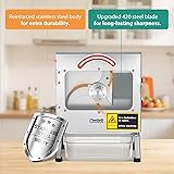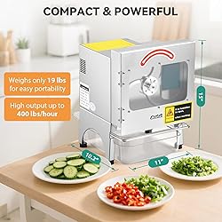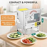 [Versatile Ingredient Handling]---This commercial vegetable slicer features a conveyor belt system that accommodates long vegetables like green beans and scallions, as well as soft fruits such as bananas, minimizing length restrictions. It cuts both hard and soft produce efficiently, making this electric vegetable cutter ideal for diverse kitchen tasks without added limitations. [Durable Stainless Steel Construction]---Built with premium stainless steel blades for sharp, long-lasting performance, this heavy duty vegetable slicer ensures fast cutting and enhanced kitchen efficiency. Its thickened, sturdy design includes a large viewing window to monitor progress, and a food-grade conveyor belt for reliable automatic feeding. [Adjustable Cutting Precision]---Easily customize your cuts with this automatic veggie & fruit slicer by adjusting blade speed for finer slices and conveyor speed for chunkier pieces. Thickness ranges from 1-35mm via two intuitive knobs, allowing flexible control over food preparation for consistent results in any setting. [Safety and Visibility Features]---Safety is prioritized with an automatic shut-off that activates when the cover opens, ensuring reliable operation. The large viewing window provides real-time monitoring, while the high-friction, food-grade belt feeds ingredients smoothly, making this electric vegetable cutter user-friendly and secure. [High-Efficiency Commercial Use]---Designed for kitchens, restaurants, and hotels, this heavy duty vegetable slicer boosts productivity with a 400 lb/h output, equivalent to about 10 workers. Its robust build and automatic functions make it a practical commercial vegetable slicer for busy environments.
