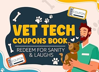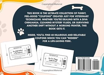 - Feeling overworked, under-caffeinated, and up to your elbows in fur? This book is for you.The Vet Tech Coupons Book: Redeem for Sanity & Laughs is the ultimate collection of funny, feel-good "coupons" created just for veterinary technicians. Whether you're dealing with a diva Chihuahua, cleaning mystery fluids, or surviving another shift without a working printer, this book gets it.Inside you'll find 5 empty coupons to customize and 40 hilarious pre-made and relatable coupons you can "redeem" for life-saving perks like: ☕ One Emergency Coffee Run 🧻 One Shift Without a Poop Explosion 💬 One Free “I Told You So” Use them to vent, laugh, gift to a coworker, or just remind yourself that you’re a rock star in scrubs.Because if anyone deserves a little sanity and many laughs... It’s you.