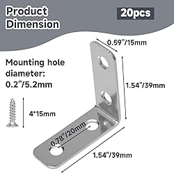 - Feature: L bracket corner brace fastener for wood furniture, cabinet drawer, bedframe, shelve. Includes 20 brackets and mounting screws, offering great value for frequent DIY repairs or projects. Specification: Size: 1.54" x 0.59" x 1.54"/39mm x 15mm x 39mm (LxWxH) Mounting Hole Spacing: 0.78"/20mm Mounting Hole diameter: 0.2"/5.2mm Screw Size: 4*15mm Material: Steel Finish: Zinc Plated Color: Silver Quantity: 20 Pieces