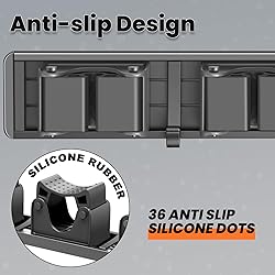 【Adjustable Broom Holder】The size of the broom holder is 17.1 x 1.97 x 2.2 inches with 4 racks and 3 hooks. Can firmly grasp tools with a handle diameter of 0.6-1.2 inches. The overall design adopts a detachable design, the clips and hooks can be rearranged at any time according to the tool size to prevent tool overcrowding 【One Handed Operation】The unique design of the broom holder wall mount allows you to easily remove and put back tools such as brooms and mops with just one hand. There is no need to worry about detachment during use. It's your perfect choice to get rid of chaos 【Anti Slip and Durable】The bottom plate and hook of the broom hanger wall mount are made of high-quality aluminum alloy plate, and the clip is made of high-quality rubber with 36 anti slip points designed. Both materials have excellent anti rust and waterproof performance, Can be used both indoors and outdoors 【Easy to Install】This wall mounted mop organizer comes with screws and expansion screws, making it suitable for walls of various materials. You can easily complete the installation in a few minutes, which can be used in laundry rooms, kitchens, bathrooms, utility rooms, garages, gardens, etc 【2-Year Customer Service】As a professional brand seller, we are committed to providing safe, practical, and affordable solutions. With our 24/7 customer support and 2-year quality assurance covering any manufacturing defects, you can rest assured