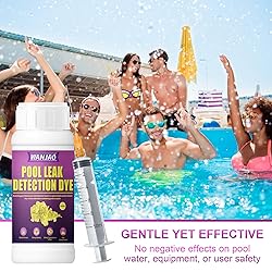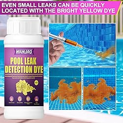 Pool Leak Detection Kit: Ultra-concentrated formula clearly highlights even the smallest leaks without staining surfaces. Quick Leak Detection: Instantly reveals hidden pool leaks with bright fluorescent glow, saving time and water. Locking tips extend reach for testing drains, fittings, and tight spaces. Works Day or Night: Fluorescent dye visible even in low light, measure and inject dye precisely near cracks, seams, or suspected leak points.ideal for pinpointing leaks in drains or dark areas. Easy To Use: Fill the pool to normal water level, turn off the pump, and wait for 10 minutes. Insert the tip of the applicator into the fluorescent leak detection liquid to fill, then place the tip ½ inch away from the suspected leak point and squeeze out 2-3 ml of pool dye. The dye will flow to the leak point, revealing its location. Pool Dye Leak Detection Kit:Includes 100ml leak detection dye,1 (5ml) applicators and 2 versatile 2” locking tips.The straight tip reduces water disturbance for accurate testing, while the angled tip reaches tight spots behind plumbing and jets.