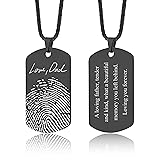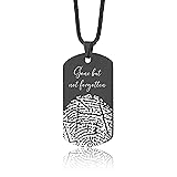 - Keep someone special close to your heart with this Personalized Fingerprint Memorial Necklace - a beautiful and meaningful way to honor the memory of a loved one. This military-style dog tag pendant features your loved one’s actual fingerprint, along with a handwritten message or your custom text engraved in the font of your choice. Crafted from durable stainless steel and available in silver, gold, rose gold, or black, it’s designed to last as a timeless keepsake. You can also personalize the back with a name, date, or short message to make it even more special. A heartfelt memorial gift for men or women, ideal for remembrance, sympathy, or grief support.