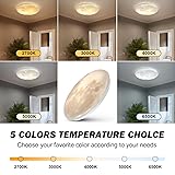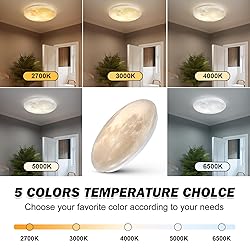 - Bring the Moon’s Magic IndoorsUnlike flat-printed moon lights, our 15" ceiling fixture uses layered 3D texturing to replicate lunar shadows and elevation changes. The steel-backed acrylic diffuser scatters light evenly—ideal for creating celestial calm in bedrooms or nurseries at night.Light That Evolves with Your NeedsCycle through five scientifically calibrated color temperatures:2700K-3000K: Wind-down warmth for evening relaxation4000K-5000K: Neutral clarity for hallway safety6500K: Alertness-boosting light for laundry tasksNote: Manual wall-switch control only (no app/remote)Engineered for Lasting Performance Reduced Flicker Operation: Tested under IEEE 1789 parameters for consistent light output Damp Location Ready: Sealed acrylic resists humidity in bathrooms* or entryways Space-Optimized Design: 15x15x3" dimensions illuminate 80 sq ft areas without overpoweringSimplified Home UpgradeWorks with standard 120V wiring. Pre-assembled components attach directly to junction boxes—transform living rooms, closets, or media spaces in three steps.
