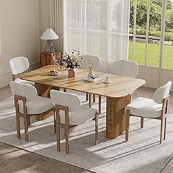 【Dining table Set】This dining table set features a sleek oval table paired with 6 stylish chairs, creating the perfect centerpiece for your dining area. Designed for both functionality and aesthetics, it provides ample space for family meals or entertaining guests. 【Oval Corner Design】The oval corners of our dining table are designed not only to enhance its elegance, but also to prioritize safety. The rounded edges minimize the risk of bumps and scrapes, making it an ideal choice for families with children. Enjoy a stylish dining experience without compromising safety. 【Stable Table Legs】Our dining table features an innovative wave leg design for unparalleled stability. This reliable structure withstands daily wear and tear, guarantees durability, and provides you with a safe dining and gathering space. It is the perfect addition to any dining area. 【Ergonomic Chairs】 The curved backrest and soft upholstery provide excellent support, helping to maintain good sitting posture. And reduces the risk of back pain or discomfort. Whether you're looking for comfortable seating in a dining room, living room, office space, bistro or farm, our upholstered dining chairs are sure to enhance the space to perfection. 【Wide Application】 This dining table and chair set can be easily integrated into any space and enhance the quality of the space. Whether it is a dining room, bedroom, study or meeting room. This dining table set can adapt to your lifestyle and needs. It is the first choice for modern dining table sets.