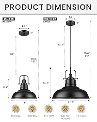 MODERN & INDUSTRIAL: Featuring a metal dome shade with an industrial design in a matte black finish, this 1 light barn pendant lights is made of sturdy metal construction, perfectly meeting your modern decoration expectations. EASY INSTALLATION: Hard wired. Includes all mounting hardware for quick and easy installation. Comes with an 83.7" adjustable cord. These kitchen pendant lights can be applied to a sloped ceiling to meet your space needs. BULB REQUIREMENTS: Requires 1 x E26 base 60W bulb per light(Halogen, LED, or CFL). Bulb sold separately. ETL LISTED & WARRANTY: ETL is listed for your safety. It is backed by a 1-year manufacturer's warranty. This black kitchen island pendant lights is ideal for your dining room, kitchen, living room, bedroom, warehouse, entryway, foyer, corridor, restaurant, cafe, bar, club, barn, and working bench. 7/24 QUALITY SERVICE: We provide a 30-day money-back guarantee for any reason. If you have any quality or skill problems like glass shade broken/replacement parts/installation problems, just feel free to contact us for easy and fast customer service.