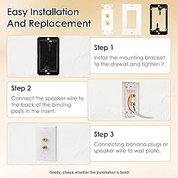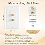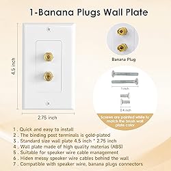 Speaker Wire Management : Suitable for speaker wire cable management. Hides messy speaker wire behind the wall, keeping them creating a clutter-free environment. Prevents dust accumulation, ensuring optimal performance and longevity of your speaker wire and devices Banana Plug Wall Plate : The speaker plug wall plate with female ports on both sides can connect to speaker cable concealed behind the wall; Binding post terminals on speaker wall plate have red and black ring labels on both sides for easy identification. The cable wall plate uses screw-type binding post and is connected with 12 to 18 AWG bare speaker wire, banana plugs or spade connectors. The binding post terminals is gold-plated. Compatible with speaker wire, banana plugs connectors. The Banana plug can terminals of this speaker wire wall plate connects a single speaker Keep Neat & Tidy : You can decorate the walls in your home theater to hide speaker wire cables. Hide the cables in the wall and keep a nice appearance, no wire mess. The wall plate fits flush to the wall and runs the speaker wire cable from one side to another end. Can effortlessly conceal cables in home theater, living room, office, studio, entertainment centers, audio zones. Ensuring a clutter-free environment Package Content : You will get 4 white 1.0 Speakerwall plates. 8 Banana plug, 4 black low voltage mounting bracket. And with mounting screws Easy to Use : Just plug speaker cable into the front end and one into the back. And connect to speaker cable concealed behind the wall. Does not require soldering. Use it with low voltage mounting bracket