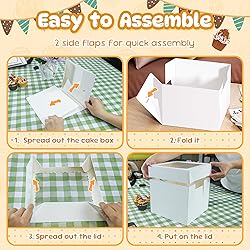 【3 Pack Cake Boxes】The package contains 3 PCS 10 inch cake boxes, 3 PCS 10 inch round cake boards made of cardboard, and 3 kinds of different stickers, DIY cake box according to your preference, stick beautifully designed stickers on the cake box, to express your love and suitable for different celebration scenes. 【Cake Boxes 10 inch】The square cake box size is 10"L x 10"W x 8"H, cake board is 10 inch in diameter.It's the perfect fit for your multi-layer cakes under 8 inch tall, can also hold pies, cupcakes, donuts, cookies, pizza and more.This baking box will be your perfect choice. 【Easy to Assemble】Cake boxes half-folded state, with pre-folded line, therefore, you need to assemble it before use, and each box only takes a few seconds to assemble.We comes flat packed to protect your cake boxes from being damage during transportation, it does not take up space, making it convenient for you to store and assemble. 【Clear Window & Thickened Cake Boards】Our cake boxes on top with wavy shaped clear windows design, without opening the lid, perfectly display your beautiful cakes! The cake boards is made of thickened cardboard, which is sturdy and durable, has strong load-bearing capacity, and can firmly support the cake. 【Perfect Choice】This exquisite cake boxes with cake boards, use as a cake container, bakery box, cake carrier, treat box, cake transport container and more.Suitable for birthday parties, baby showers, weddings and other occasions.In addition, it is also suitable for various festivals such as valentine's day, mother's day, thanksgiving day and christmas best choice.(The box paper is FSC certified.)