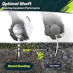 Sturdy Design for Durability: Thicker body ensures long-lasting strength, effortlessly penetrating thick grass or hard ground without any risk of bending or breaking Reinforced 4-Prong Head Design: The sturdy 4-prong structure improves stability, ensuring the ball stays firmly in place for a smooth, consistent swing Innovative Head Design Reduces Friction: Reduces contact between the tee and ball to help lower drag and support smoother drives. Striped Marking for Consistent Height: Features clear stripe markings to help with consistent tee-up height, supporting more consistent golf hits. Value Pack: Includes 100 tees (2-3/4" ), each featuring SAPLIZE's exclusive design for enhanced reliability and performance