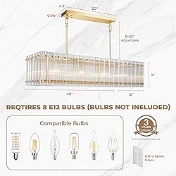 ✨ Luxurious Golden Frame with Ribbed Glass: Crafted from premium handmade glass with elegant vertical ribs, it creates captivating layered shadows. The thickened, anti-yellowing material ensures lasting clarity, while the golden finish adds a touch of modern opulence." 📏 Flexible Height & Easy Installation: Adjust the 40-inch fixture from 10" to 55" to perfectly fit your space. Installs easily on sloped, flat, or vaulted ceilings. Scan the QR code for a quick setup video. 🏡 Elevates Any Decor Style: The warm gold frame and refined ribbed glass enhance modern, glam, or transitional interiors. Ideal above kitchen islands, dining tables, and in luxury living rooms. 💡 Dimmable Ambiance Control: Requires 8 E12 bulbs (not included). Use dimmable bulbs with a compatible switch to set warm, cool, or natural light and create the perfect atmosphere. 🔒 Complete Peace of Mind: Includes an extra glass shade + gloves. Backed by a 3-year warranty and 24/7 support. Free replacement should any damage occur during shipping.
