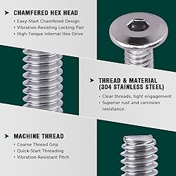 Package Includes: 16 Sets of 1/4 x 1-1/4" Screws and 1/4 x 5/8" Binding Nuts, plus a hex wrench Thread Size: 1/4-20; Thread Type: Full Thread; Screw Head Dia: 0.5 inch; Wrench Size: 5/32 inch Material: Constructed from 304 Stainless Steel which delivers superior corrosion resistance and strength; Ideal for harsh environments—including high temperature, freezing conditions, and high humidity—it requires no costly or time-consuming maintenance Wide Range of Applications: Those furniture screws are widely used in the manufacturing and assembly of wooden furniture, such as cabinets, chairs, tables, shelves, and other household items; They provide a strong and secure connection between wood components, ensuring the stability and durability of the furniture pieces Special Design: They are fasteners designed for assembling and securing wooden furniture pieces together; The flat head design allows the screw to sit flush with the furniture surface when installed, providing a clean and finished look; They are also black coated to resist corrosion and rust, ensuring long-lasting performance; They come in different thread sizes and lengths to accommodate different thicknesses of wood and assembly needs