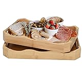 2-Pack Wooden Trays: Two Sizes, Perfect for Any Use: Includes one small tray (14.5" x 9.8" x 2") and one large tray (15.75" x 11" x 2"). Designed to fit seamlessly into your living space, bedroom, or kitchen. Durable Bamboo Tray: Crafted from natural bamboo for long-lasting use, easy cleaning, and wood appeal. Sturdy wooden construction is reinforced with gold metal handles which make it easy to carry these trays. Surely a smart choice if you are looking for outdoor serving tray. Versatile & Practical: Ideal as an Ottoman tray for remotes and decor in living room, a coffee bar accessory holder on your coffee table, a serving tray for guests (hosting essentials!), a breakfast-in-bed companion, or a cozy couch dining partner, a handy organizer tray for kitchen counter. Elegant Design with Golden Metal Handles: Features stylish scalloped tray and sleek golden metal handles for easy carrying and a touch of sophistication. Blends functionality with decorative charm to elevate your home aesthetics. Stackable & Space-Saving: Easy to store when not in use—simply stack the trays to maximize space without compromising functionality.