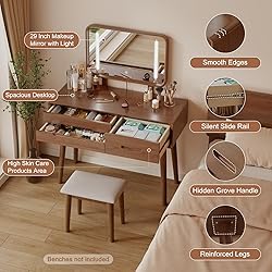 IMPORTANT: Stool sold separately. The vanity stool shown in the images is not included. If you experience any issues with your order, please contact us first—we're here to help and will make it right for you. LOW HEIGHT ALERT: 29.5" table + 48.8" top of mirror + 21.4" space check the ruler in the photo gallery and match your height before ordering 【Premium Quality Material】Made from 100% FAS-grade rubberwood, our products combine strength, durability, and a smooth, natural finish. This solid wood material ensures both beauty and resilience 【3 in 1 design】Vanity,nightstand and desk are combined into an all-in-one of vanity.It can be placed in different settings. It is a more practical design 【Large Mirror with 3-Color Dimmable Lights & 4-Height Settings】It features a 3-color dimmable light that adjusts seamlessly, offering warm, neutral, and cool lighting options. With 4 adjustable height settings to fit everyone 【Spacious Storage Space】Spacious tabletop and 3 large drawers that provide perfect space to store and organize your precious lipsticks makeup, perfumes, jewelry, other beauty supplies, and more in different places 【Easy Assembly & Support】Simply attach 4 legs to complete setup for this vanity. Tools and instructions included. Sturdy packaging ensures safe delivery. Enjoy 24/7 support for a hassle-free purchase.