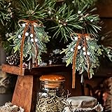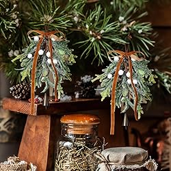 - Features: Suitable for various holiday decoration needs, can be applied with other Christmas decorations, such as decorative garland light strings, to add highlights to gifts! They can be hung in the kitchen, living room, bedroom, door, window, tree or other Christmas decorations. The Set of 2 christmas artificial mistletoe ornament with berries will give your home that unique holiday atmosphere. Specifications: Material: polyethylene and alloys Color: green and white Size: length 9.84 inches Package includes: 2 Artificial mistletoe picks with brown bow Notes: Manual measurement, please allow slight errors on size. The color may exist a slight difference due to different screen displays.