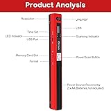 【Widely Compatible】This portable scanner is compatible with various operating systems, including Windows 2000/ME/XP. It works seamlessly with popular software like Windows imaging and OCR software. Quickly scan images or pictures and store files in seconds, plug and play, no pre-installed software required. 【High Resolution Scanning】It has a powerful A4 color optical sensor and provides 3 resolution modes for you to choose: 300dpi/600dpi/900dpi, you can save pictures and documents in the clearest way. Whether you need crisp text or vividly colored photos, this scanner delivers outstanding results. 【Up to 32GB Storage】Ultra-large storage capacity, supports 32G Micro SD card, all JPEG/PDF formats are available, fully meeting your needs for business travel or daily use. Store and share your scans and information as searchable PDF files or JPEGs to a micro SD/TF card. 【Simple Operation, Efficient and Practical】Long press the switch to turn on the machine, select the color mode and resolution, press the "Scan" button until the green LED lights up, scan the document, just press it (it will be completed automatically after 3 minutes of no operation). At 900DPI, you can scan a page in just 10 seconds, perfect for busy professionals or students with heavy document workloads. 【Portable and Convenient】This handheld scanner has a compact size and lightweight design (about 0.31lb), making it very easy to carry. It's perfect for busy professionals, students, or anyone who needs to digitize documents while travelling. It is powered by two AA batteries (not included).