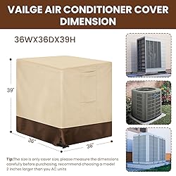 A+ GRADE DURABLE MATERIAL: Vailge air conditioner cover is crafted from heavy-duty 600D Oxford fabric with waterproof & UV resistant coating, double sewn and high-density stitching on edge & connection which is more durable and rip resistant. And our ac cover offers MAXIMUM protection against harsh elements like torrential rain, snow, UV rays, dust, and debris, preventing rust to extend your unit's life. EASY TO USE: Large padded handles make removal of air conditioner covers easy, while air vents reduce inside condensation and wind lofting. And the ac unit covers outdoor feature a side opening flap that allows easy access for pipes. SECURE WINDPROOF FIT: Vailge ac unit cover features an adjustable drawstring and the sturdy buckle at the bottom to ensure a snug and secure fit on your ac unit. It stays firmly in place even during strong winds and storms, giving you COMPLETE peace of mind. PERFECT YEAR-ROUND PROTECTION: Vailge central air conditioner covers are built to last through all seasons,suitable for all-weather protector. It shields your unit from intense summer sun AND freezing winter conditions, making it a SMART investment for your home. UNIVERSAL COMPATIBILITY: Vailge 36"Wx36"Dx39"H ac cover for outside unit is designed to fit MOST standard outdoor central air conditioner condenser units. Please double-check the product dimensions (L x W x H) against your unit to GUARANTEE a perfect fit.