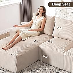 Engineered for cloud-like comfort, our modular sectional sofa features an all-foam construction with pressure-relieving springs and high-resilience foam for perfect support. The premium PP cotton surface adds a luxuriously soft touch, creating that 'just-right' sink-in feel. Our cloud sofa rises to 17.7 inches (most sofas are around 16 inches) for optimal leg comfort. The backrest is also added with a cylindrical cushion for enhanced support, ensuring relaxation whether you're reading or watching TV. Compression Sofa Modular System: Our innovative modular design adapts effortlessly to your space, with flexible configurations for any occasion. Expand your comfort by adding cloud-like ottomans for extra seating or lounging—all designed for seamless customization. No Assembly Required: Arrives fully compressed and ready to unfold - no tools or setup needed. From box to comfort in 96 hours, perfect for apartments, homes, or anyone seeking instant luxury seating without the hassle. Soft Corduroy: The boneless sofa's innovative construction finds its perfect match in premium corduroy. This fabric's thermal regulation (warm yet breathable) and textured surface enhance the sofa's signature compartmentless support system, creating multidimensional comfort.