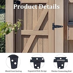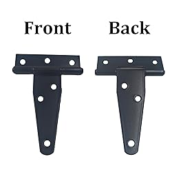 Package including: You will receive 2PCS Black T-Strap Shed Hinge with mounting screws. The size of the door hinge is 100 x 85 x 33mm / 3.93 x 3.34 x 1.29 inches, and the thickness is 1.8mm. Superior Weather Protection: These heavy duty T-strap hinges feature premium black paint coating that resists rust and corrosion. The rustproof gate tee hinges maintain structural integrity through harsh weather conditions, ensuring reliable performance for outdoor sheds and barn doors year-round. Robust Load Capacity: Engineered with reinforced steel construction, these black rustic iron hinges support substantial weight without sagging. The heavy duty design accommodates thick wood fences and large barn doors, providing stable operation for demanding agricultural and residential applications. Versatile Mounting Options: Perfect for both left and right-hand installations on various structures. These rustproof tee hinges work seamlessly with cedar, pine, and pressure-treated lumber commonly used in barn doors and outdoor construction projects. Authentic Rustic Appeal: The black iron finish delivers traditional farmhouse aesthetics while maintaining modern durability standards. These heavy duty hinges enhance the visual appeal of garden sheds, livestock gates, and decorative wood fences without compromising functionality.