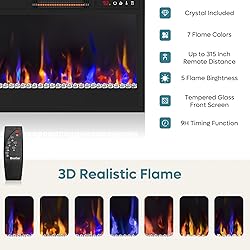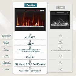 3D Flame Effect & Heating: Crystal-enhanced 3D flames with 7 auto-changing colors and 5 adjustable brightness/speed levels. 5120 BTU heater output, suitable for spaces up to 400 sq ft. Temperature adjustable from 62°F to 92°F. LED flame lifespan: approximately 50,000 hours. Can be used with or without heat for year-round enjoyment. Convenient Control & Safety Features: Includes wireless remote (26ft range) with programmable timer (0.5-9 hours) and 20-second delay shutdown. ETL and FCC certified. Equipped with overheat protection, child lock function, and a tempered glass screen. Memory function retains your previous settings. LED Light Entertainment Center: With 7 colors and 22 modes ready for instant RGB-remote switches, the TV Stand itself of this Fireplace entertainment center turns any living room or bedroom into a crackling, color-soaked holiday party in a single click. Glass Shelf TV stand: Featured 2 glass shelves, this entertainment center will create a modern style to your living room. The glass shelves could be adjusted to 3 levels for different size of things. Friendly Service: Made of CARB certified P2 particle board, the Bestier fireplace tv stand has great stability and durability. Backed by a reassuring 1-year warranty, Bestier assumes full responsibility for any quality issue.