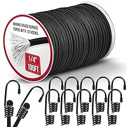 HIGH ELASTICITY & DURABILITY FOR REPEATED USE: Crafted with premium marine-grade rubber, this elastic shock cord stretches up to 100% and snaps back to its original shape, ensuring long-lasting performance for countless applications without losing effectiveness—perfect for DIY assorted bungee cords, securing gear, and heavy-duty tasks. INDUSTRIAL STRENGTH & MARINE GRADE WATERPROOF: Built with a heavy-duty Polypropylene outer shell and waterproof core, our bungee cord resists water damage, corrosion, and UV exposure, making it ideal for wet environments like kayak decks, boating, or prolonged outdoor camping, while delivering industry-leading resilience and strength. COMPLETE KIT WITH 12 BLACK HOOKS FOR SECURE FASTENING: Includes 12 durable black hooks for instant, reliable attachment—effortlessly secure tarps, bike racks, or outdoor equipment during adventures like hiking, tailgating, or camping, providing a versatile tie-down solution that keeps gear organized and in place. HEAVY DUTY SHOCK CORD FOR OUTDOOR APPLICATIONS: Engineered for marine-grade toughness and superior stretch, this 1/4" x 100ft bungee roll handles extreme loads with ease, ideal for tarp tie downs, roof racks, firewood bundling, and more, ensuring dependable use in all weather conditions. VERSATILE & MULTI-PURPOSE ELASTIC CORD: Your go-to rope for endless uses—from kayak and bike transport to home, office, or car storage. This assorted bungee cord kit excels in outdoor camping, DIY, and emergency scenarios, offering easy-to-cut customization for any need while maintaining high-modulus flexibility.