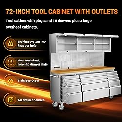- Ultimate All-in-One Stainless Steel Mobile Workshop: Organize, Work, Power Up! Transform your cluttered garage or workshop into a streamlined productivity hub! This Heavy-Duty 15-Drawer Stainless Steel Rolling Tool Cabinet isn’t just storage—it’s a complete professional-grade mobile workstation designed for mechanics, craftsmen, and serious DIY enthusiasts. Every detail, from the industrial-strength stainless steel frame to the spacious wooden workbench, is engineered for durability, versatility, and effortless workflow.