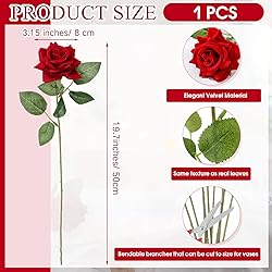Eternal Expression of Love: this red artificial flowers rose symbolizes everlasting love and intense passion, a powerful expression of emotions that words cannot express; Its color and lifelike design are a sincere reminder that your love will never fade Elegant Velvet Material: velvet rose is fluffy and delicate, silky and soft to the touch; This material reflects light softly, making the color fuller and richer, creating a romantic, retro and noble atmosphere Flexible Flower Stem: silk roses with stems real look comes with a bendable wire stem, which can be easily shaped and trimmed to suit your decoration idea, adding flexibility to your gift creation; Due to transportation, gently bend to restore best state Timeless Beauty: this 19.7 inch long, 3.15 inch flower head diameter fake rose requires no watering, sun exposure, or care to maintain its vibrant color and vibrant appearance year after year without withering or fading Ideal Gift: whether it's a romantic expression or a sincere thank you, this faux single flowers is an ideal gift for your girlfriend, mom, family, friends on Valentine's Day, Mother's Day, Halloween, weddings, anniversaries or daily surprises