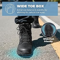 Wide Toe Box: To accommodate different foot shapes, these tactical boots for men feature a wide toe box that provides ample space for toes to splay naturally, promoting foot health for better propulsion during walking and running. Low Drop Design: With a 5mm heel-to-toe drop, these combat boots for men are designed to promote a more natural walking gait by evenly distributing weight across the foot and reducing stress on the forefoot. Easy On & Off: The smooth metal zipper makes these work boots for men easy to put on and take off. Plus, the hook-and-loop strap at the top keeps the zipper in place, ensuring these motorcycle boots for men stay snugly fitted during movement. Durable & Comfortable: Crafted with leather and wear-resistant nylon mesh, these wide toe box boots for men are robust enough to withstand harsh conditions. The lightweight EVA midsole enhances shock absorption, offering a soft and responsive feel. Slip-Resistant: These military boots for men are complete with a lugged rubber outsole that enhances grip while minimizing mud buildup, ideal for security staff, truck drivers, construction workers, factory staff, yard workers, couriers, and other jobs.