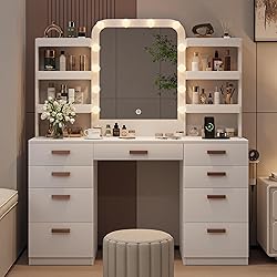 More Storage Space: This vanity table features 9 drawers (3 sizes) and 6 shelves with protective panels, providing safe, organized storage for your belongings. Its large storage capacity holds more items, freeing up space and ultimately bringing a brighter, more spacious room. Large Mirror & 3 Colors of Lights:The extra-large mirror displays every detail of your face, 3 adjustable lights cater to all your makeup needs, whether a stunning look at a holiday party or a simple makeup before work, it can save you time and help you present your best self Side Charging Station and Hair Dryer Stand: When applying makeup, you can easily access the hair dryer and curling iron. The additional USB port allows you to charge mobile phones or other electronic devices at any time. These thoughtful convenience features enhance your comfort and make your life more convenient. Material and Stability: This Makeup Vanity table is constructed from high-quality MDF, ensuring durability. Thick board adds to the bottom of the drawers to reinforce them, increase load-bearing capacity, and enhance overall stability. The robust wood boards to withstand damage during transportation and use. Detailed Instructions:All parts are marked, you can sort or arrange them before installation, then use the tool to follow the steps in the instructions to complete successfully. If any quality or installation problems during transportation and use, please contact the seller's team for professional help