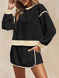 - This set features a relaxed fit long-sleeve top with drop shoulders, perfect for effortless movement and a laid-back aesthetic. The stylish color-block design at the neckline and sleeve cuffs harmonizes beautifully with the edges of shorts, creating a cohesive look that stands out.The shorts, equipped with elastic drawstrings, offer exceptional adaptability, making them suitable for a variety of body types. Their high inclusivity and flattering silhouette ensure you look and feel your best, whether you're hitting the gym or lounging on the weekend.