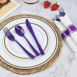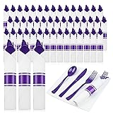 Serve 100 Guests with Ease: This 100 purple pack includes pre rolled forks, knives, spoons, and soft white dinner napkins. Perfect for serving guests at weddings, birthdays, baby showers, and more without the stress of cleanup Elegant & Stylish Design: The striking purple cutlery wrapped in white napkins creates a luxurious table setting. Impress your guests with a coordinated and refined look at any celebration Soft & Absorbent Napkins: Each rolled cutlery set includes premium linen-like napkins that feel soft, plush, and durable. Unlike standard paper napkins, they are absorbent and elevate the dining experience Durable & Food-Safe: Made from high-quality, BPA-free plastic, this disposable pre rolled cutlery is sturdy enough to handle any meal. Washable and reusable if desired, helping reduce waste compared to flimsy alternatives Perfect for Any Occasion: Ideal for weddings, anniversaries, engagement parties, graduations, bachelorette parties, family gatherings, or corporate events. A convenient solution that saves time and adds elegance.