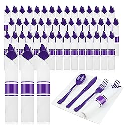 - Upgrade your event with our 100 Pack Pre Rolled Purple Plastic Silverware with Napkins—a stylish and convenient solution for any gathering. Each rolled cutlery pack includes forks, knives, spoons, and soft linen-like dinner napkins, all neatly pre-rolled for quick table setup and added hygiene. The elegant purple utensils paired with crisp white napkins create a sophisticated presentation, making them perfect for weddings, bridal showers, anniversaries, holiday dinners, and more. Crafted from durable, BPA-free plastic, this purple disposable silverware set is sturdy enough for any meal and can even be washed and reused if desired. The napkins are soft, absorbent, and far superior to regular paper napkins, adding a touch of luxury to every place setting. Whether you’re hosting a small gathering or a large event, this 100 pack makes entertaining effortless. Simply set the table, enjoy your celebration, and toss everything away for easy cleanup. Make your next event memorable with a disposable cutlery set that combines convenience, style, and quality—all in one package rolled cutlery set. Please note, these purple plastic cutlery set are not suitable for use in microwave or ovens.
