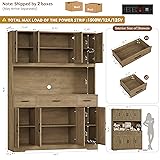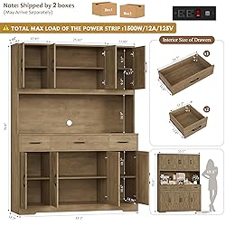 End Storage Woes: Featuring 6 generous cabinets with adjustable shelves for kitchen overflows, 3 deep drawers to organize small items and a spacious 55" wide countertop for frequently used appliances, this large kitchen pantry cabinet is definitely a storage Master! Power Outlets: Featured a built-in charging station with 2 AC outlets, 2 USB ports and a handy switch, this tall pantry cabinet powers conveniently home appliances like toaster and coffee maker while providing quick power on and off for enhanced safety and reliability Multi-Purpose Pantry: Designed for versatility, this cabinet effortlessly switch roles from food pantry in kitchen to organize caos, dining room buffet hutch cabinet to entertain guests, to living room appliance cabinet to showcase your coffee bar - It's your home's most adaptable storage piece Modern Farmhouse Hutch: Warm wood finish, striking X-grain barn door and two-tone design, all of which combines rustic appeal with contemporary style in this white pantry cabinet in a beautiful way that complements perfectly into any space Crafted To Last: Crafted from high-quality MDF and completed with reinforced structure, this wide wood pantry with drawers ensures superior stablility and durability for lasting use, while the anti-tipping device exsits for enhanced safety. Overall size: 55.1"W x 15.7"D x 71"H Strict Power Specification: This power strip is exclusively designed for low-power electrical appliances, with a strictly limited rated maximum load of 1500W/12A/125V. It will automatically cut off power in case of overload, Please check your device’s power label before plugging it in Easy Assembly: This wide pantry cabinet is hassle-free to assemble with the straightforward instructions and labeled pieces. NOTES: Two adults are recommended for assembly because of the large product size