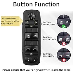 Replace Part Numbers: 4602632AB, 4602632AC, 4602632AD, 4602632AE, 4602632AF, 4602632AG, 4602632AH, 04602632AC. Only fit for Front Driver Side with 1 AUTO, It doesn't fit the models with 2 AUTO or Non AUTO. Compatible With: For Jeep Liberty 2008 2009 2010 2011 2012, For Dodge Nitro 2008 2009 2010 2011 2012, For Dodge Journey 2009 2010. This switch has No rearview mirror folding function button. If your old switch has this button, please not purchase this one. Package Include: 1x Power Window Switch + 1x Switch Removal Tool. Features: Terminal Quantity: 8 Pins+ 13 Pins. Position: Front Left Driver Side. Color of the Backlight: Green Light. Auto: 1 Auto. Made of environmental ABS plastic & PP plastic, anti-burning, heat resistant, impact-resistant, properties for long service life. High Quality: Direct replacement for a proper fit and easy installation, meets or exceeds OEM standards, 100% tested before shipping. Just need to remove your original master power window control switch and install, plug in and then use. Note: Please confirm your OE Number, vehicle model, year, whether our product has the same appearance as your original switch before purchasing. Especially confirm if the slots on the back of the product are the same, if it is different from your original switch, it is not suitable for your vehicle. PINS CHECK REQUIRED! PLEASE CHECK PLUG OF ORIGINAL PART! IF THE PINS DO NOT MATCH, THIS PART WILL NOT FIT YOUR CAR.