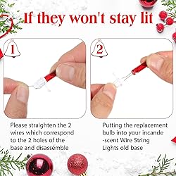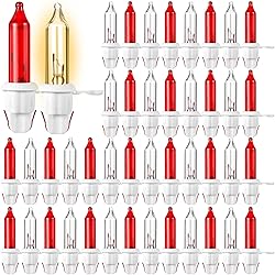 Christmas Replacement Mini Light Bulbs: the package includes 60 Christmas replacement mini bulbs, which bring a soft festive atmosphere to your Christmas; These Christmas tree small light string replacement bulbs are 3.5 V, 0.12 A, 0.42 W, Suitable for 50-light, 100-light, 150-light light strings, please check the specifications of your own lights carefully before purchasing Replacement Method: first, unplug the power plug of the bulb, remove the damaged bulb and its base, then check whether the two wires of the new bulb are correctly placed on both sides of the base (do not let them cross or touch), then insert the new bulb at a right angle and make sure it is fully pushed in, and finally reinsert the bulb into the power plug to see if it is successful Red and Warm White Light: christmas lights use red light and warm white light lighting effects to create a warm and romantic holiday atmosphere; Choose the color that suits your usage scenario, suitable for artificial Christmas trees, garlands, and are very suitable for replacing existing bulbs that have burned out or aged Quality and Safety: incandescent mini Christmas lights are made of quality materials, safe to use, suitable for Christmas trees, indoor, outdoor, party decorations; The base bottom diameter is 0.4 cm/0.16 inches, the base height is about 1.1 cm/0.4 inches, and the base and bulb junction diameter is about 0.7 cm/0.28 inches; You need to determine whether the light string is suitable based on this size Wide Application: these Christmas tree replacement bulbs are suitable for indoor and outdoor decoration, Christmas, Halloween parties, Valentine's Day, wedding parties, homes, windows, bathrooms, festivals, holidays, performances, restaurants, hotels, commercial buildings, shopping malls, trees, garlands, wrapped trees, terraces, pavilions, bushes, hedges, fences, pillars, etc