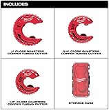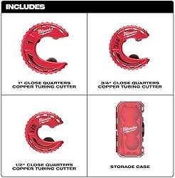 - The MILWAUKEE® Close Quarters Tubing Cutters are optimized for tough cuts in tight spaces. The compact design allows access to the tightest spaces. Chrome rollers deliver best in class rust protection while integrated weep holes allow water to drain from the tool. Directional grip allows better handling and quick identification of swing direction for easy use. Includes 1/2", 3/4", and 1" cutters and a storage case that fits in PACKOUT™ Low-Profile Organizers.