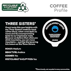 - The kickass coffee your Keurig coffee maker has been waiting for! Great taste hits new heights with our Three Sisters medium roast coffee blend, which owes both its name and its uncompromising taste to our impressive roots. Because we believe that when you drink mountains, you can move mountains — just like the towering trio known as the Three Sisters. We pay homage to these powerful peaks with a triple punch of light, medium, and dark roasts in every Three Sisters K-Cup pod. Beans from Central and South America combine to create a full-bodied medium roast blend brimming with a complexity highlighted by notes of stone fruit and cocoa. And the inviting aroma of dried fruit, toasted coconut, and milk chocolate makes this a smooth, savory, and seductive medium roast coffee. For the boldest coffee in your cup, brew on the smallest cup size. In the middle of nowhere in the Rocky Mountains, Kicking Horse Coffee was born. And it was born kicking. Kicking for purpose, quality, what’s right, and what’s fair. And since then, they haven’t stopped kicking. This coffee is proudly certified Fair Trade and organic, and a deliciously bold kick in the you-know-where. Always was and always will be. Wherever you are in the world, wake up and kick ass with Kicking Horse Coffee. Each Kicking Horse Coffee Three Sisters K-Cup pod is filled with premium, freshly ground coffee beans and is compatible with all Keurig single serve coffee makers. Simple. Delicious. And recyclable.* Enjoy the same great-tasting coffee you know and love, and when you’re done, just peel, empty, and recycle. *Check locally, not recycled in many communities.