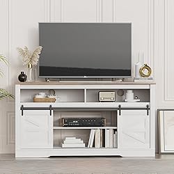 TV Stand with Fireplace: The item will be delivered in two packages. Combined TV table, storage cabinet and fireplace, the TV stand provides you a good solution for your living room in winter. Sliding Barn Door: The TV stand is equipped with two removable sliding barn doors, which makes it look nice. And compared to drawer design, sliding design are more convenient. Farmhouse Style: Designed in farmhouse style, the TV stand shows a vintage and casual flavor. Balancing aethetics and use, it can fit most living room. Large Storage Space: There are two hidden storage space behind the doors and two open storage space. The hidden space can be used to place some daily necessities. And your DVDs and game console can be placed in the open storage space. Easy Assembly: The item comes with a clear introduction and a package of screws, with which you can easily assemble it.