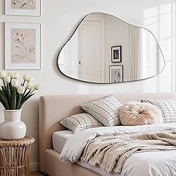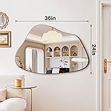 UNIQUE ASYMMETRICAL AESTHETIC: Elevate your space with this 36x24 inch irregularly shaped mirror. Breaking away from traditional geometry, its organic lines create a stunning visual focal point. The frameless design offers a sleek floating effect, making it a perfect statement piece for modern, Art Deco, or minimalist interiors. Add an artistic touch to your bedroom, living room, dining room, entryway, salon, or studio. SAFETY CRAFTSMANSHIP: Designed with safety in mind, this frameless wall mirror features premium HD float glass backed by an explosion-proof film. Even if impacted, the glass holds together to prevent splashing, ensuring safety for families with kids or pets. The edges undergo meticulous polishing and rounding, eliminating sharp corners to provide a soft, safe touch and a sleek, sophisticated aesthetic. HD CLARITY & TRUE REFLECTION: Enjoy a crisp, natural view every time you look in the mirror. Crafted with high-quality silver backing, our irregular asymmetrical mirror delivers a bright, distortion-free image that stays true to reality. Whether you are focusing on makeup details at the vanity or checking your full outfit in the hallway, it offers the reliable 1:1 clarity you need to look and feel your best. Multiple Installation: Unlike standard mirrors, we empower your creativity. While 2 D-hooks are pre-installed on the sturdy MDF backboard, we include 2 EXTRA D-hooks to give you total control. Simply attach them with a screwdriver to customize the hanging angle—vertical, horizontal, or slanted—to suit your vision. These extras also serve as convenient replacements for long-term use, or you can choose to lean the mirror against the wall for a relaxed aesthetic. SECURE PACKAGING & SATISFACTION: We use reinforced packaging materials to ensure your aesthetic mirror arrives intact. Buy with confidence for your home or commercial office decor. If you encounter any questions, please contact us immediately.